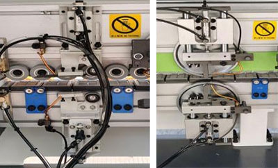 6輪壓貼貼合比4輪更精密,膠線輕微不跑帶,貼合牢靠,厚薄木皮均可輕松走帶,氣缸控制開關(guān)膠門,膠量穩(wěn)定,厚薄均勻。 |