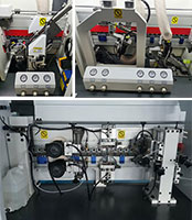 6輪壓貼貼合比4輪更精密,膠線(xiàn)輕微不跑帶,貼合牢靠,厚薄木皮均可輕松走帶,氣缸控制開(kāi)關(guān)膠門(mén),膠量穩(wěn)定,厚薄均勻。 |